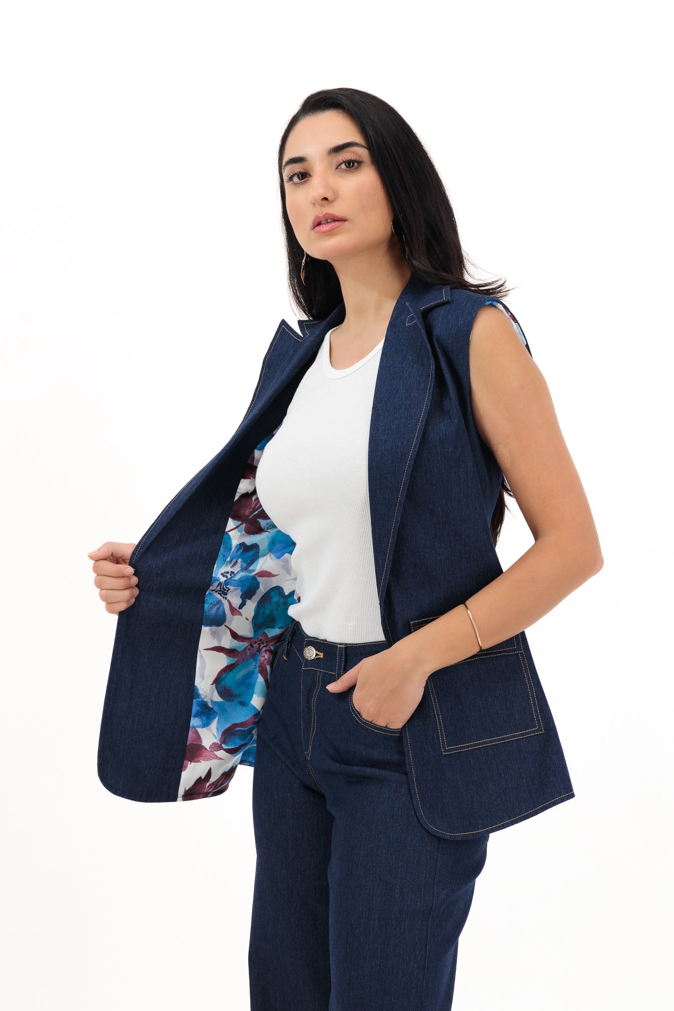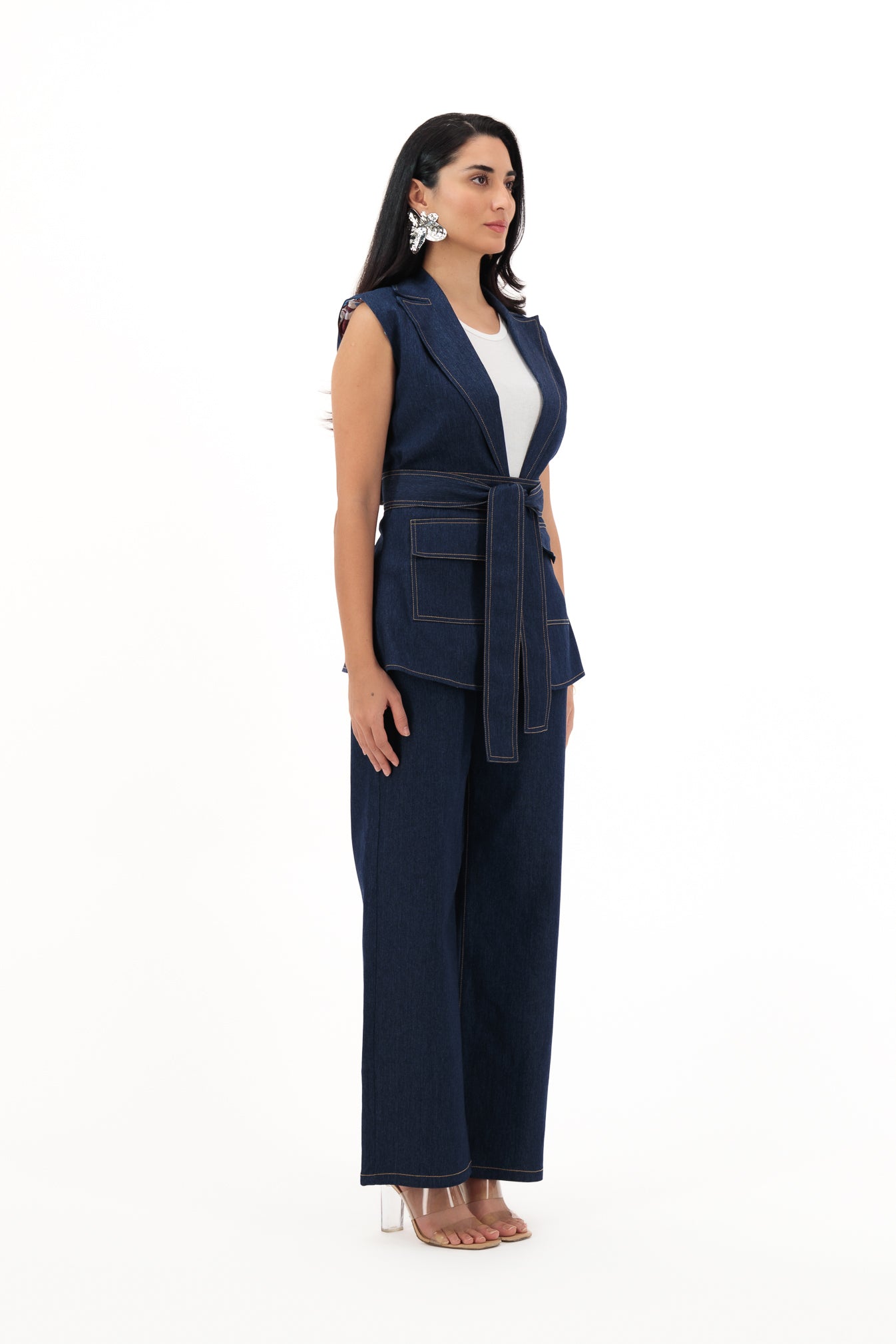 Where structure meets freedom. Denim Muse is a sleeveless jeans-inspired suit set reimagined for the modern woman. Casual yet commanding, it’s your go-to for days when you need comfort with a touch of cool.